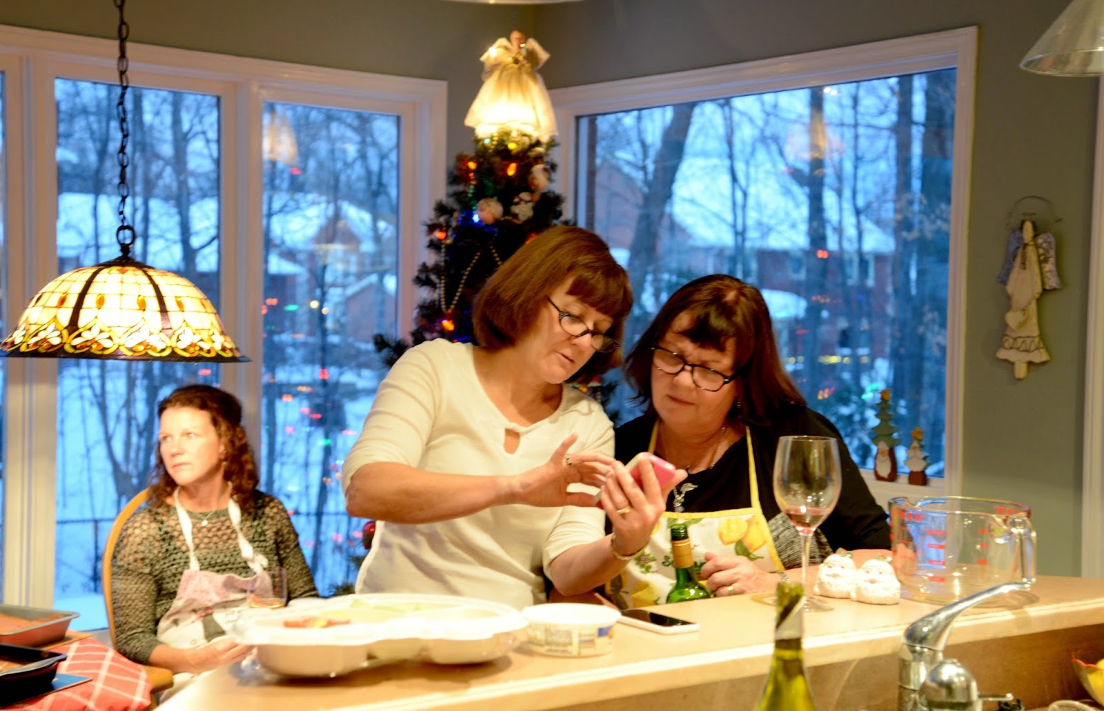The kitchen warms up and the champagne is popped. As you can see my kitchen isn't huge and with 6 women and the oven on, we all take turns opening the patio door. It must be the heat from the oven making us all so hot, nothing to do with the Hot Flashes :)